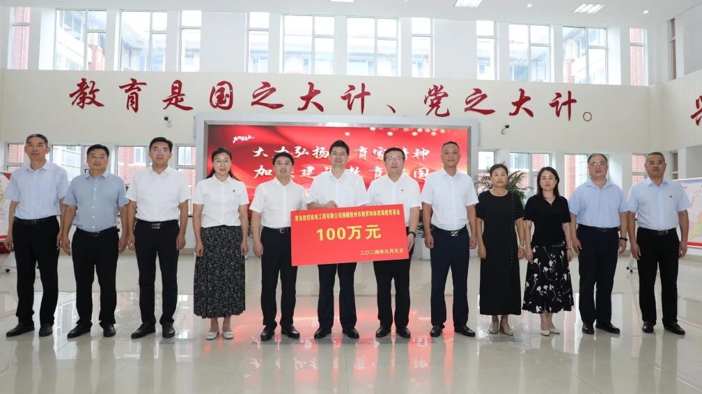 9月5日,在第 40 個教師節(jié)來臨之際,青島軟控機電工程有限公司向膠州市教育和體育局捐贈100萬元,儀式在膠州市教育體育局舉行。膠州市委常委、統(tǒng)戰(zhàn)部部長,市政府副市長董如增出席;膠州市教育和體育局黨組書記、局長、市委教育工委常務(wù)副書記尹少杰,青島軟控機電工程有限公司總經(jīng)理武守濤參加儀式并講話。