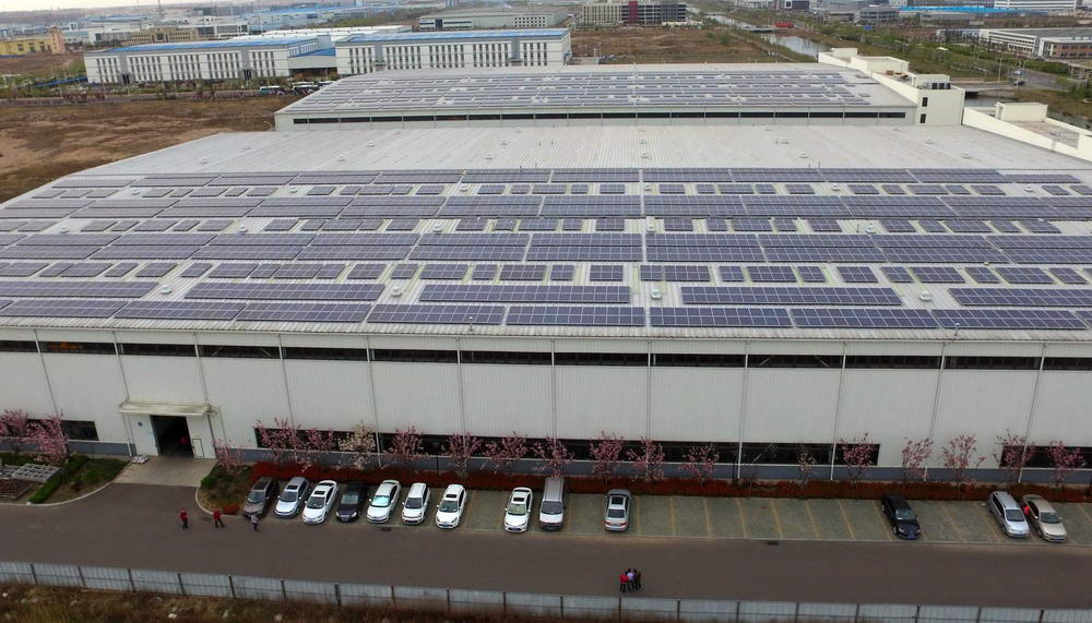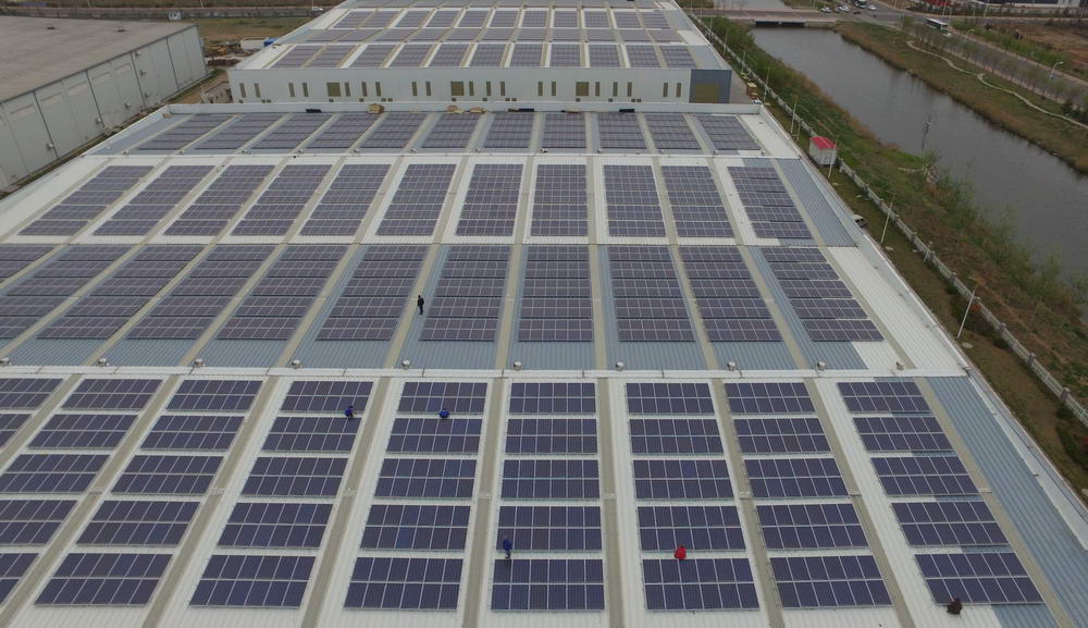 借此機會,青島華控能源牽手青島高新區內的科捷機器人和佳友機械廠,在其房屋頂建設了光伏發電項目作為試點。一塊塊一人多高的矩形太陽能板均勻的排列在廠房屋頂,十分規整,科技感十足,這就是光伏發電裝置。太陽能板平鋪在廠房屋頂既節約了空間,同時也可以讓太陽能板充分接受陽光照射。